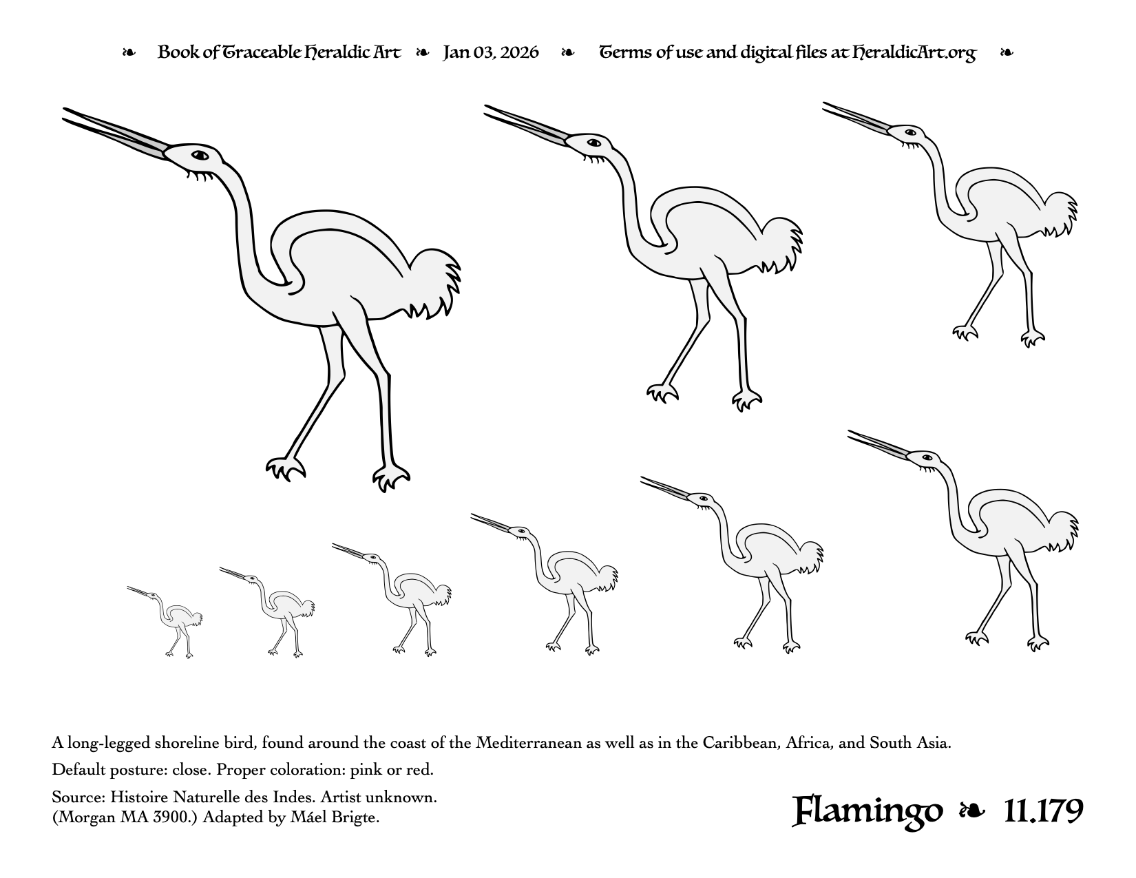 Default posture: close. Proper coloration: argent, with gules (or pink) feet and beak.