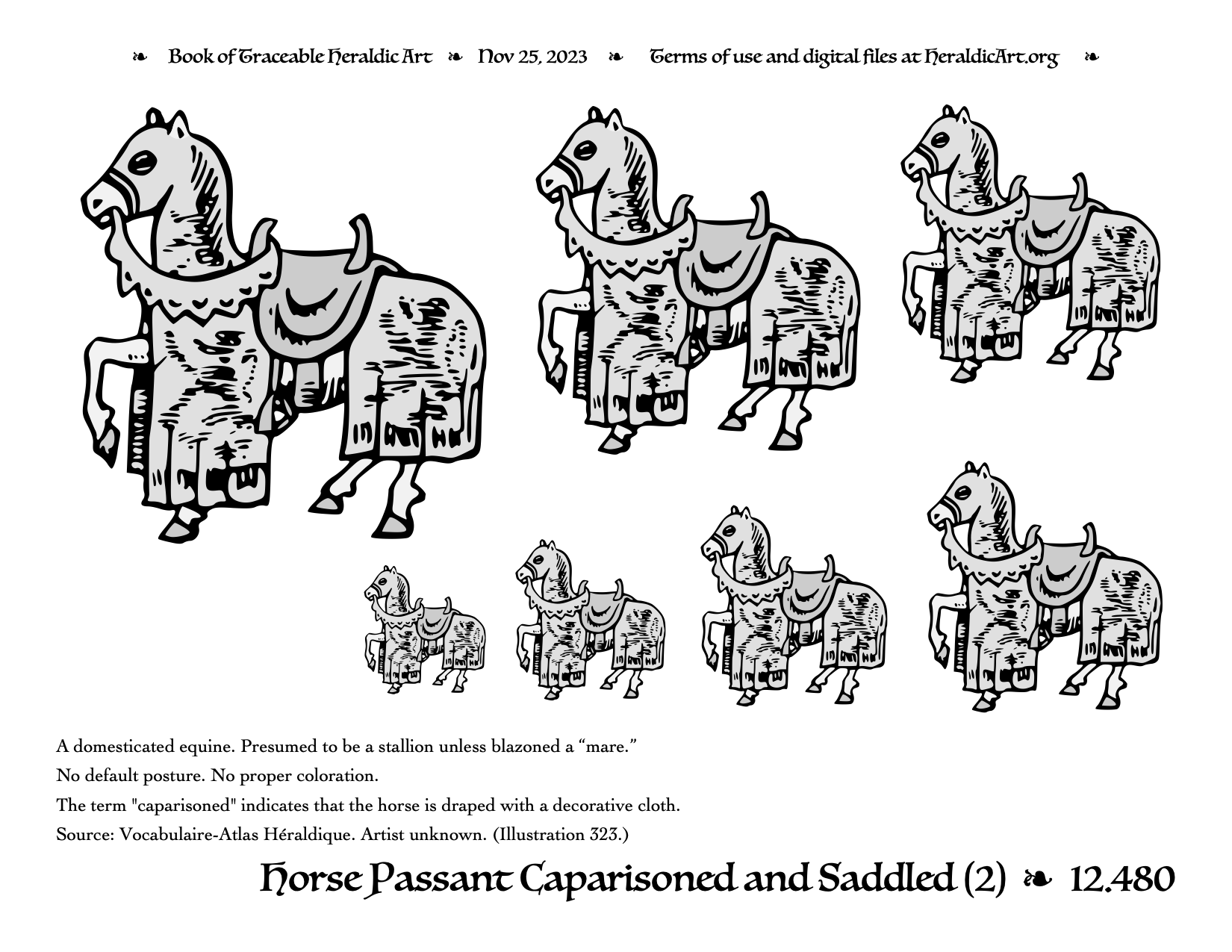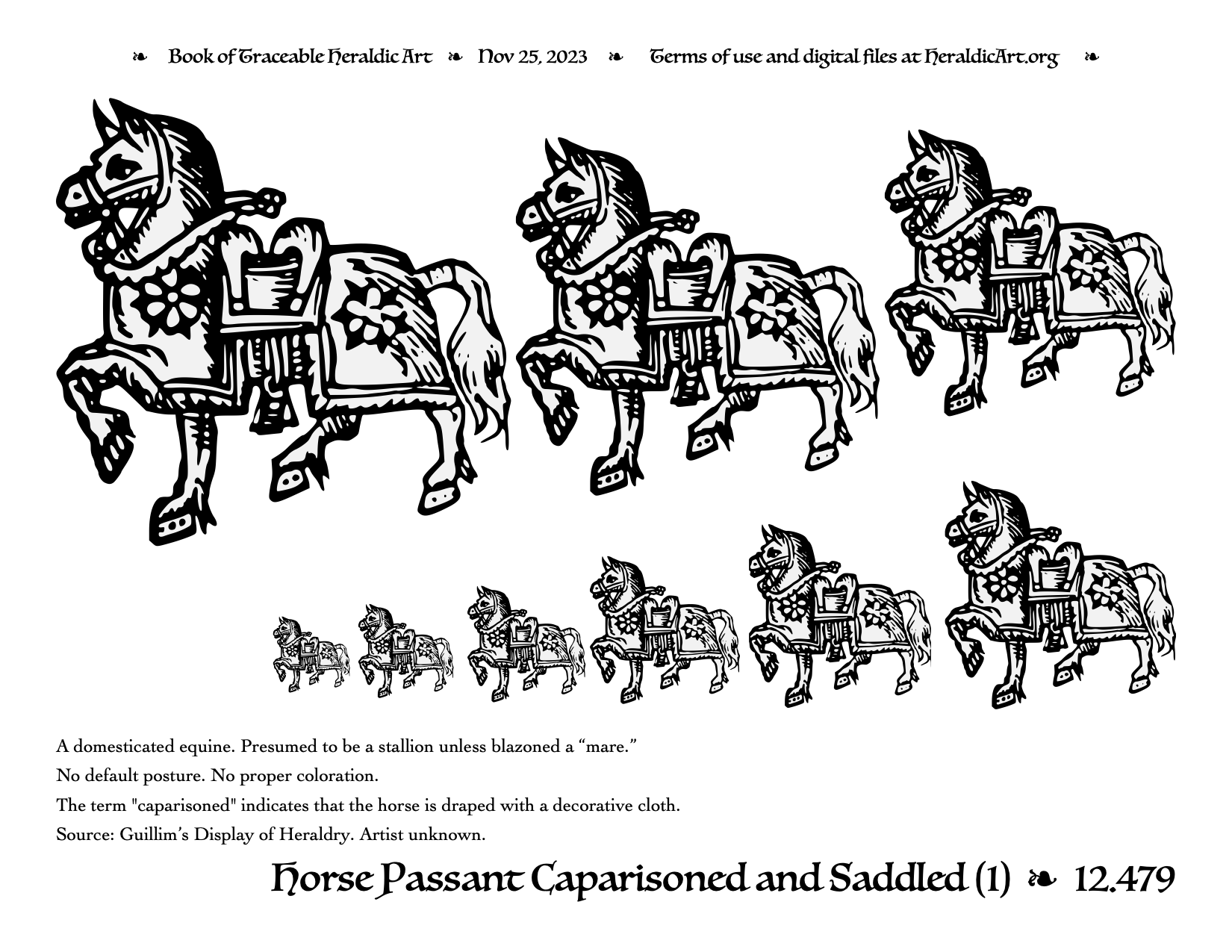 The term "caparisoned" indicates that the horse is draped with a decorative cloth.