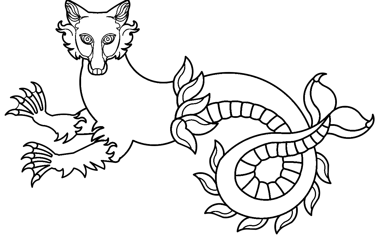 Default posture: naiant. Typically drawn embowed or embowed counter-embowed. Proper coloration: green with red fins.