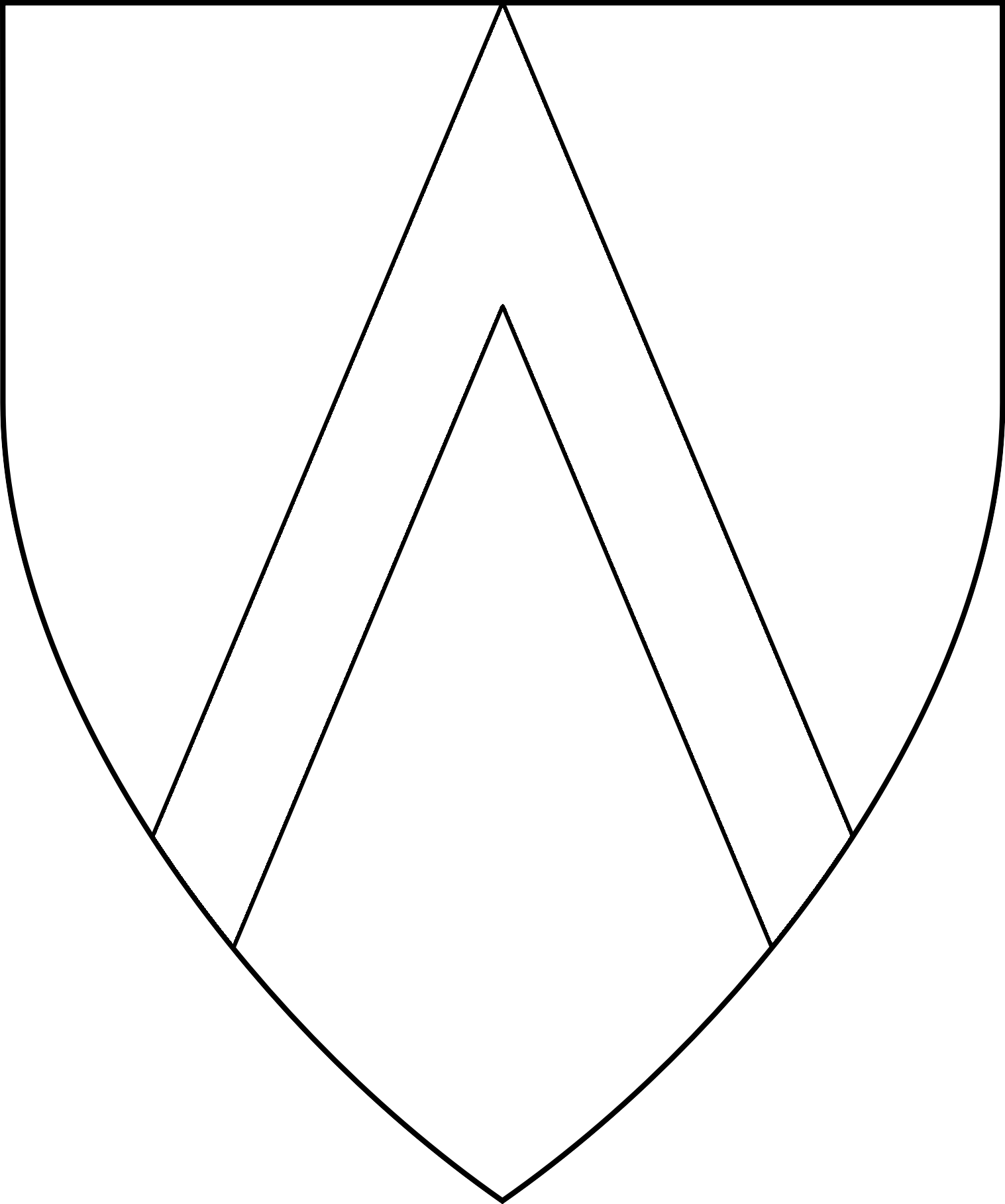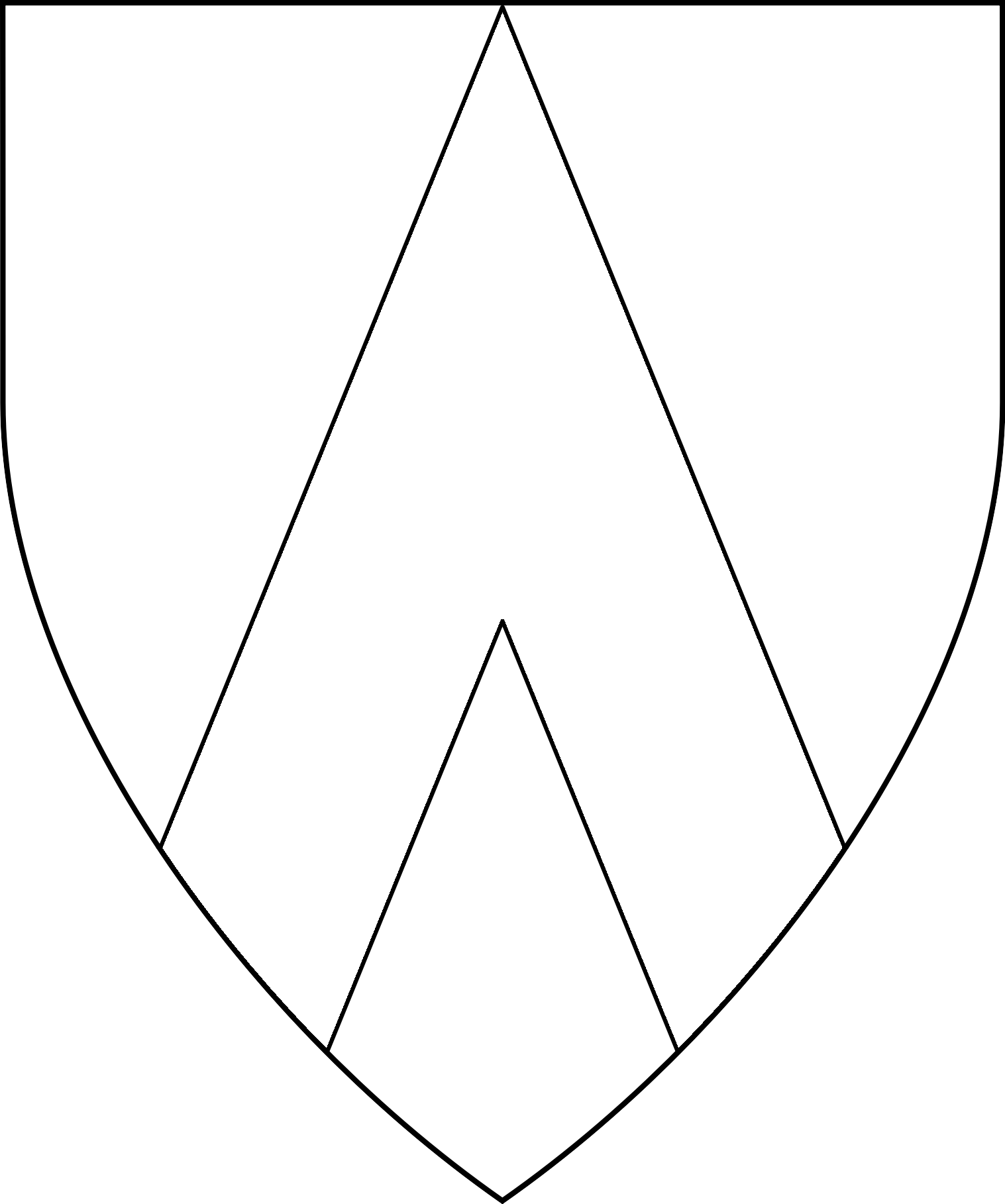 Central ordinary. Must issue from sides of device. Must be centered on the fess line, except if shifted up or down to accommodate secondary charges. Angle may be narrower or wider than 90°.